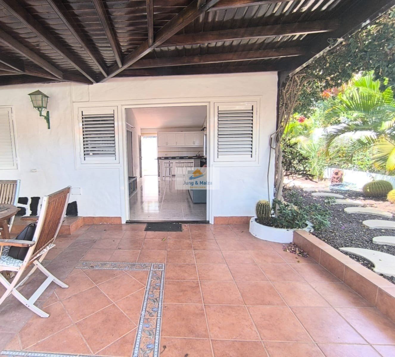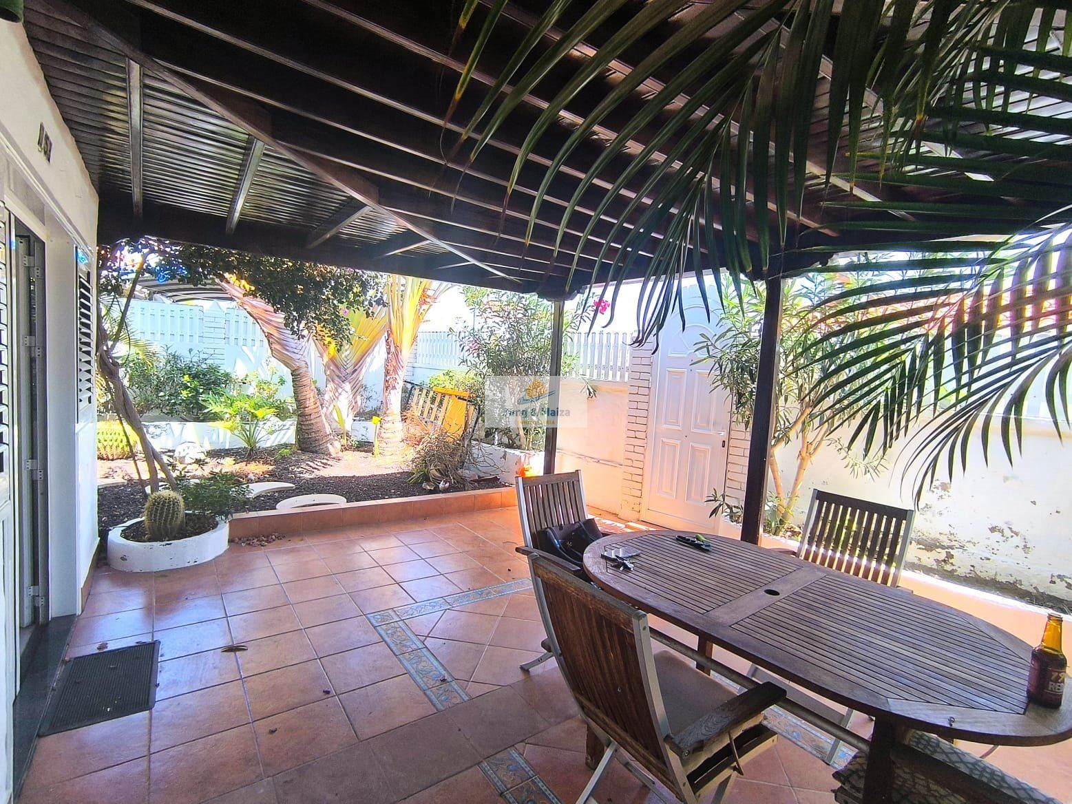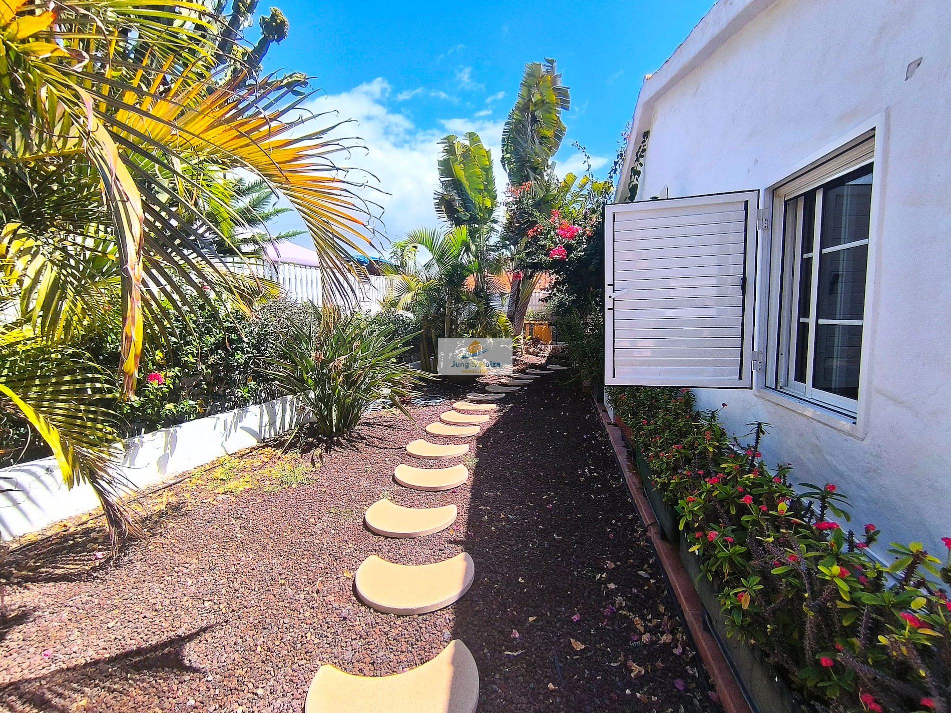 This charming bungalow has two bedrooms, two bathrooms, a living room and kitchen in the same space, a covered front terrace with a dining table, a garden with lush vegetation surrounding the house, and another rear terrace. Very bright, air-conditioned, and in very good condition. Located a few steps from the Yumbo shopping center, it is also very close to the beach and all amenities. Complex with three swimming pools and beautiful, well-maintained common areas.