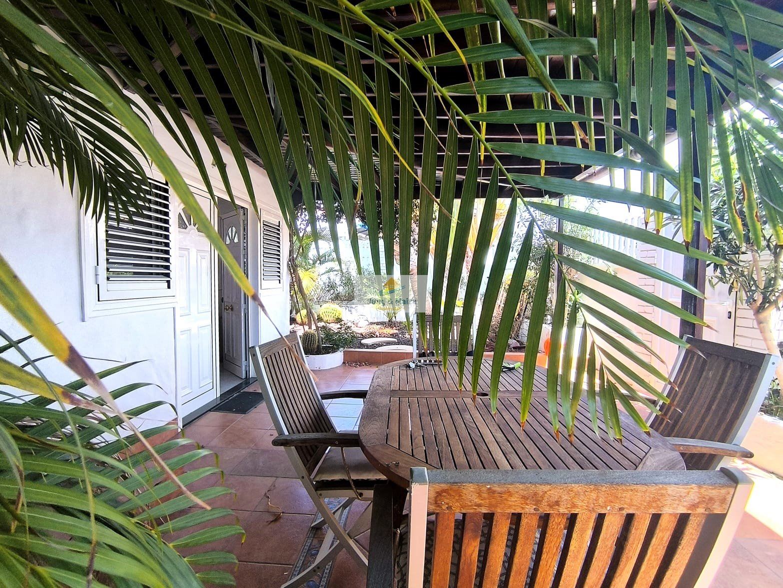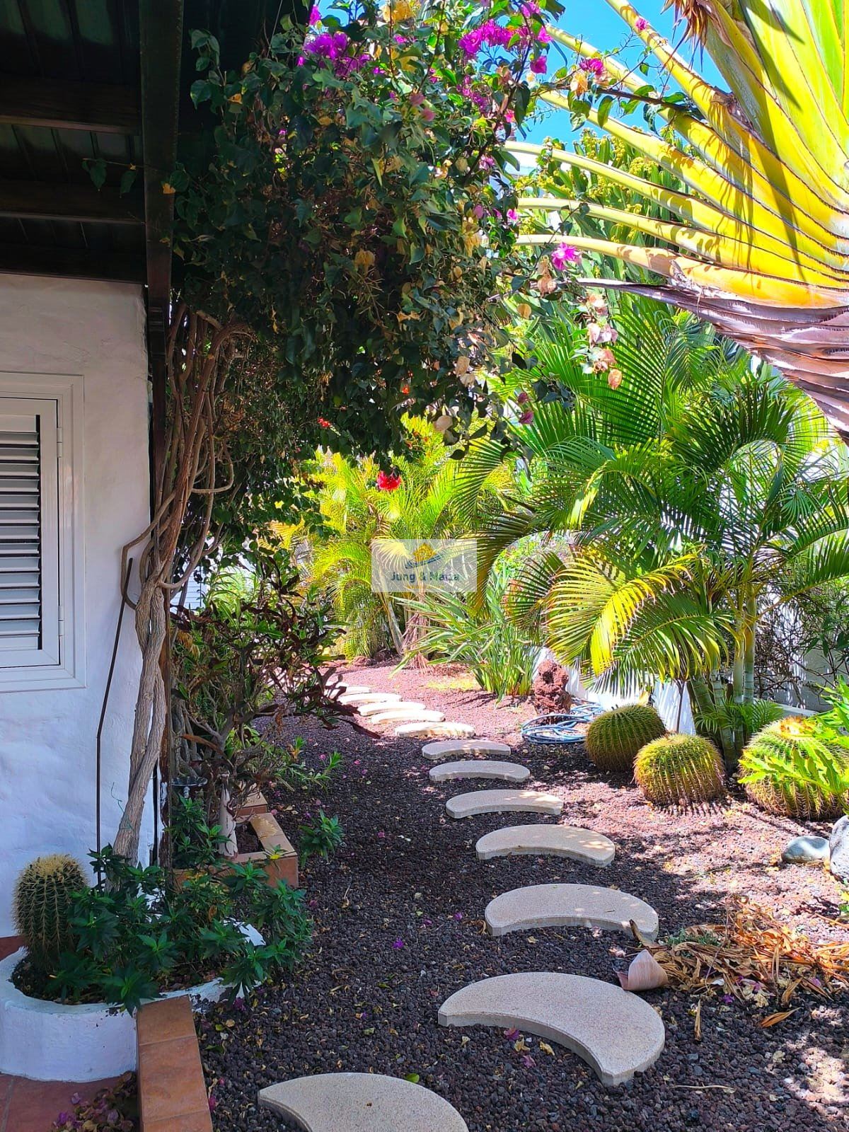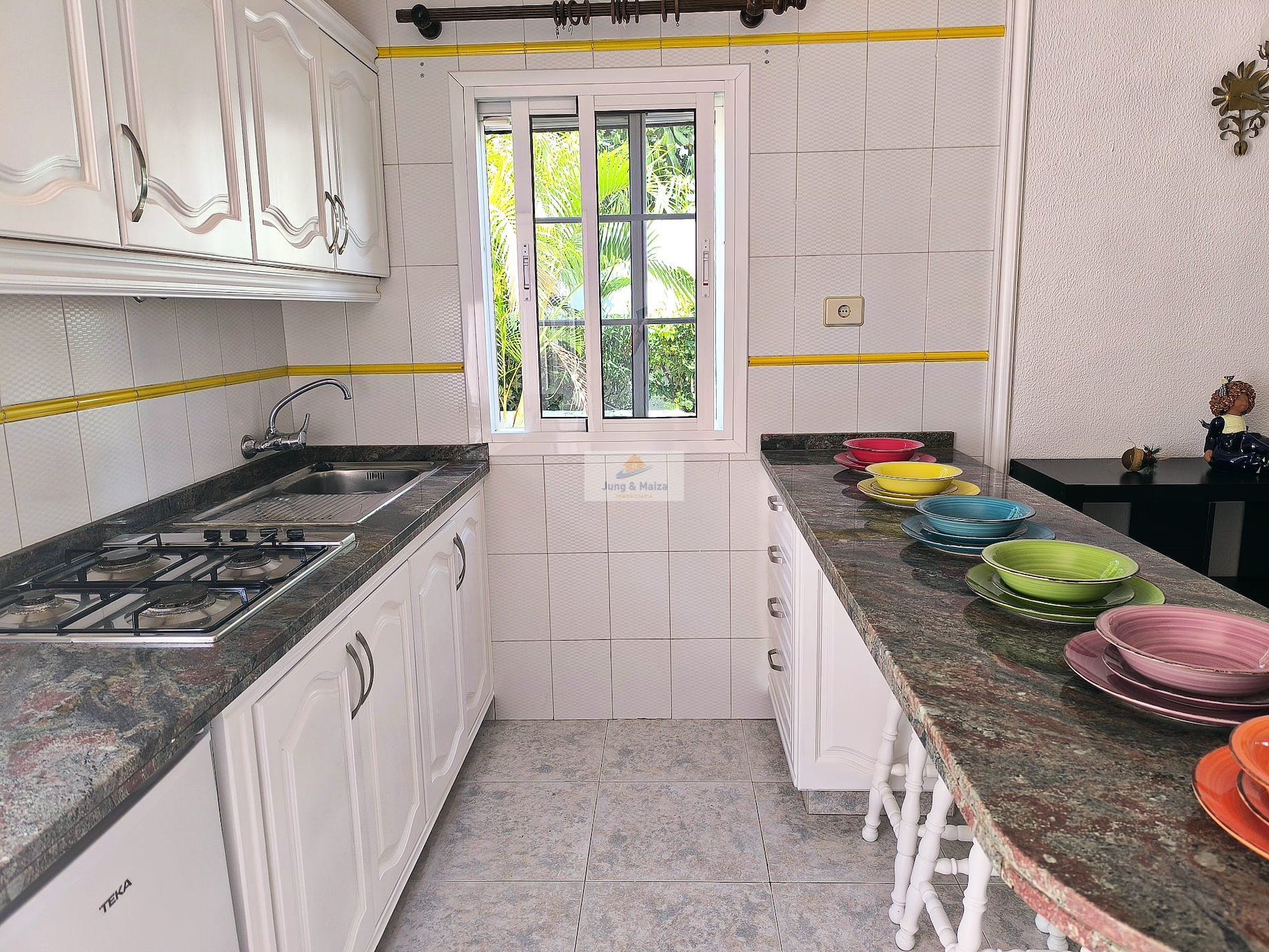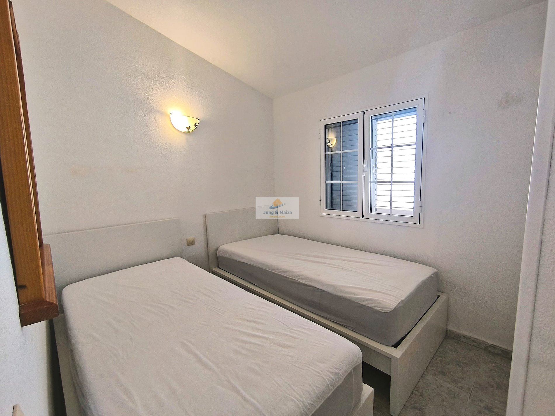 This charming bungalow has two bedrooms, two bathrooms, a living room and kitchen in the same space, a covered front terrace with a dining table, a garden with lush vegetation surrounding the house, and another rear terrace. Very bright, air-conditioned, and in very good condition. Located a few steps from the Yumbo shopping center, it is also very close to the beach and all amenities. Complex with three swimming pools and beautiful, well-maintained common areas.