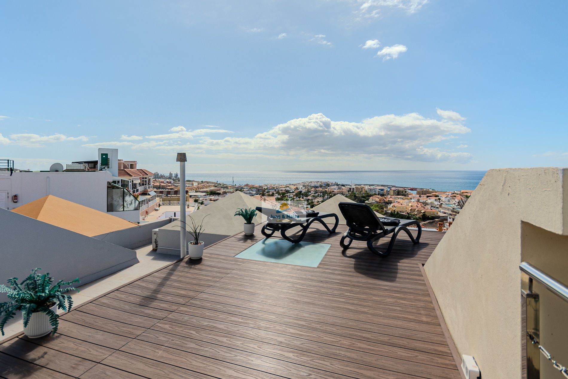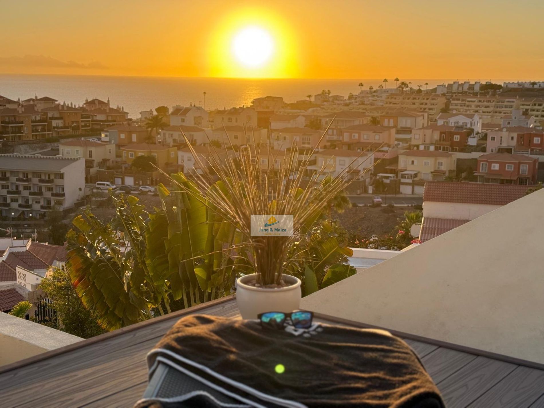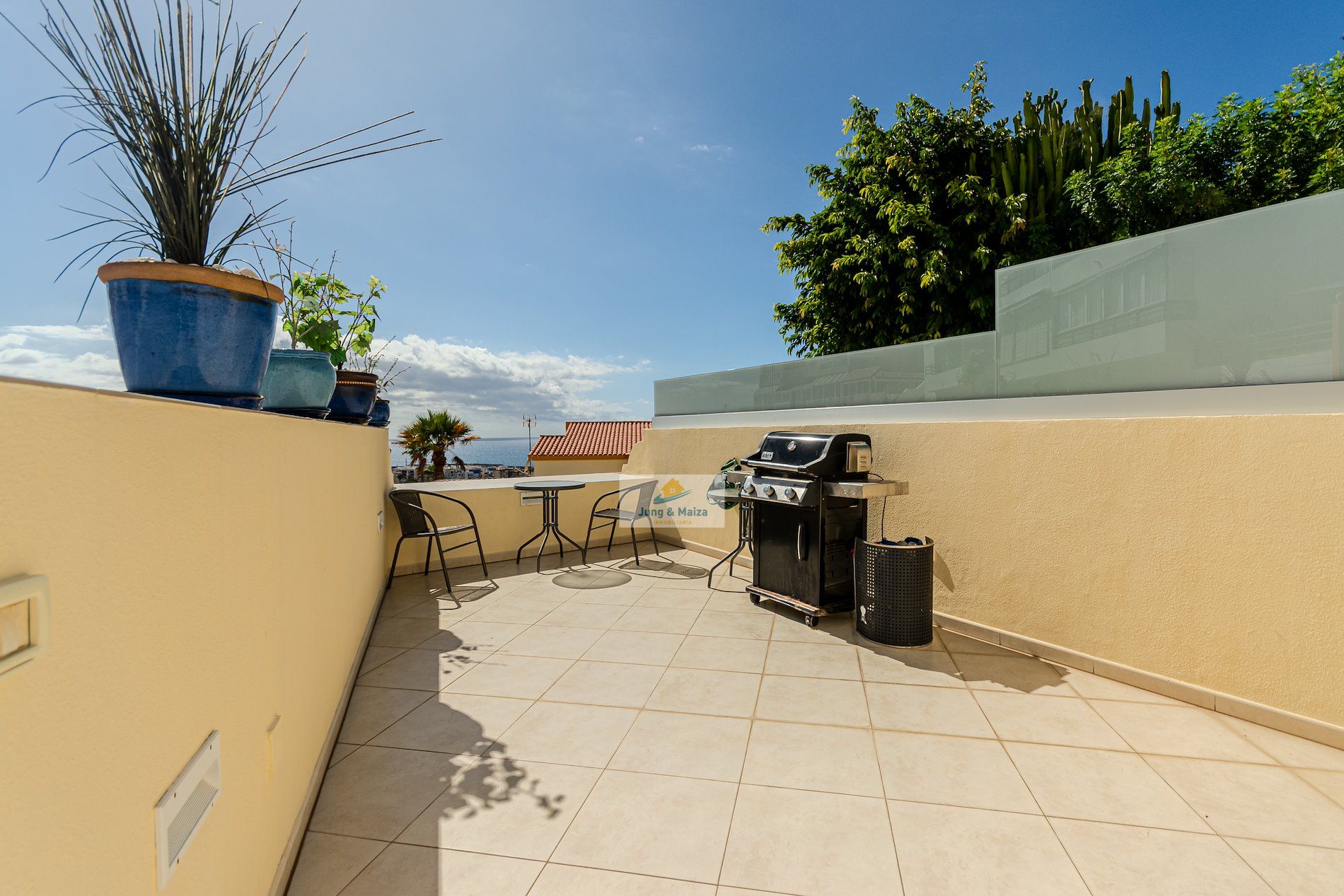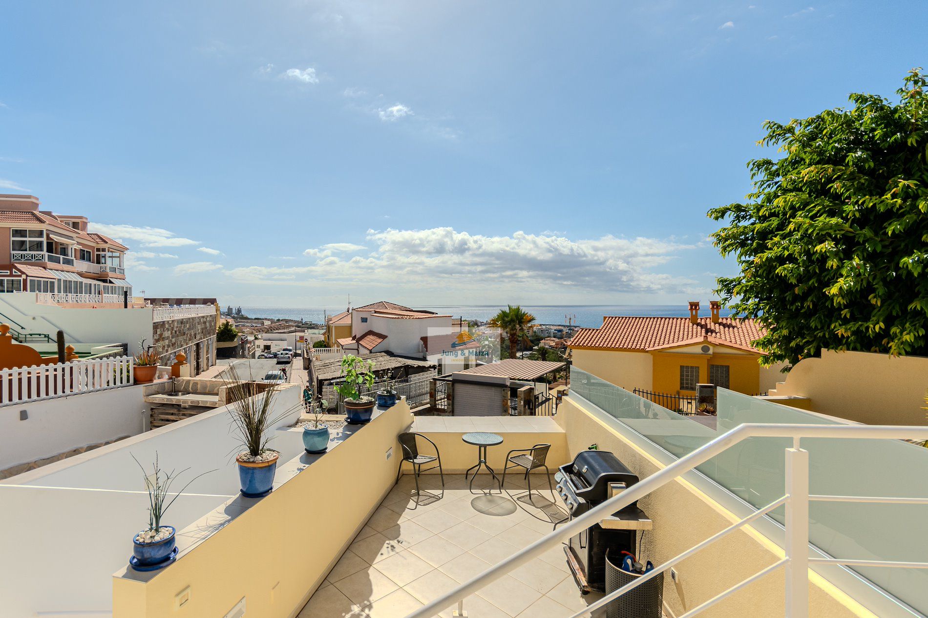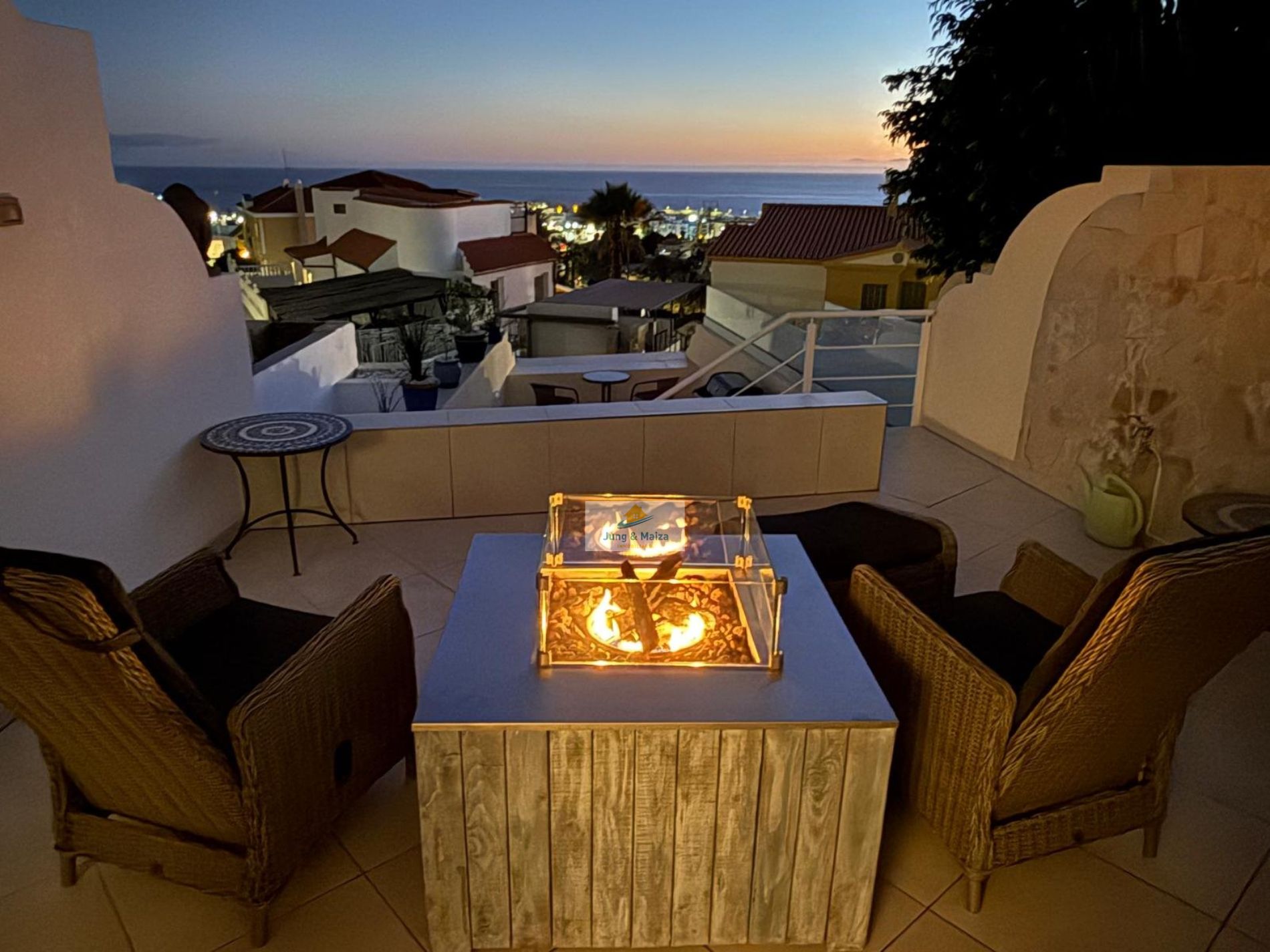 This townhouse combines modern living comfort with a unique ocean view. The house boasts three terraces, offering a Mediterranean flair and unforgettable sunsets over the Atlantic. Perfectly south-facing, the property enjoys sunshine throughout the day. All terraces and balconies offer breathtaking views of the Atlantic Ocean, making this location truly unique. Experience breathtaking sunsets right from your home. The property is sold furnished. GARAGE NO COMMUNITY FEES � Property Description • Three bedrooms, one with a stunning sea view • Spacious living and dining room with access to the terrace • Modern, very large fitted kitchen • Newly renovated bathroom and separate guest toilet • Garage with electric roller door and remote control � Highlight terraces with Atlantic views • Roof terrace (approx. 30 m²) with unobstructed panoramic views • Terrace off the living room with a gas fireplace – perfect for cozy evenings • Additional south-facing terrace with guaranteed sunshine and sea views • New, spacious awning for shaded areas ✨ Amenities • All rooms with new air conditioning and TV Equipped • Living room with modern 85-inch TV and electrically adjustable leather sofa • Bedroom with high-quality box-spring beds • Dark-tinted south-facing windows – ideal for privacy and a pleasant indoor climate • Washing machine available • Weber gas grill included.